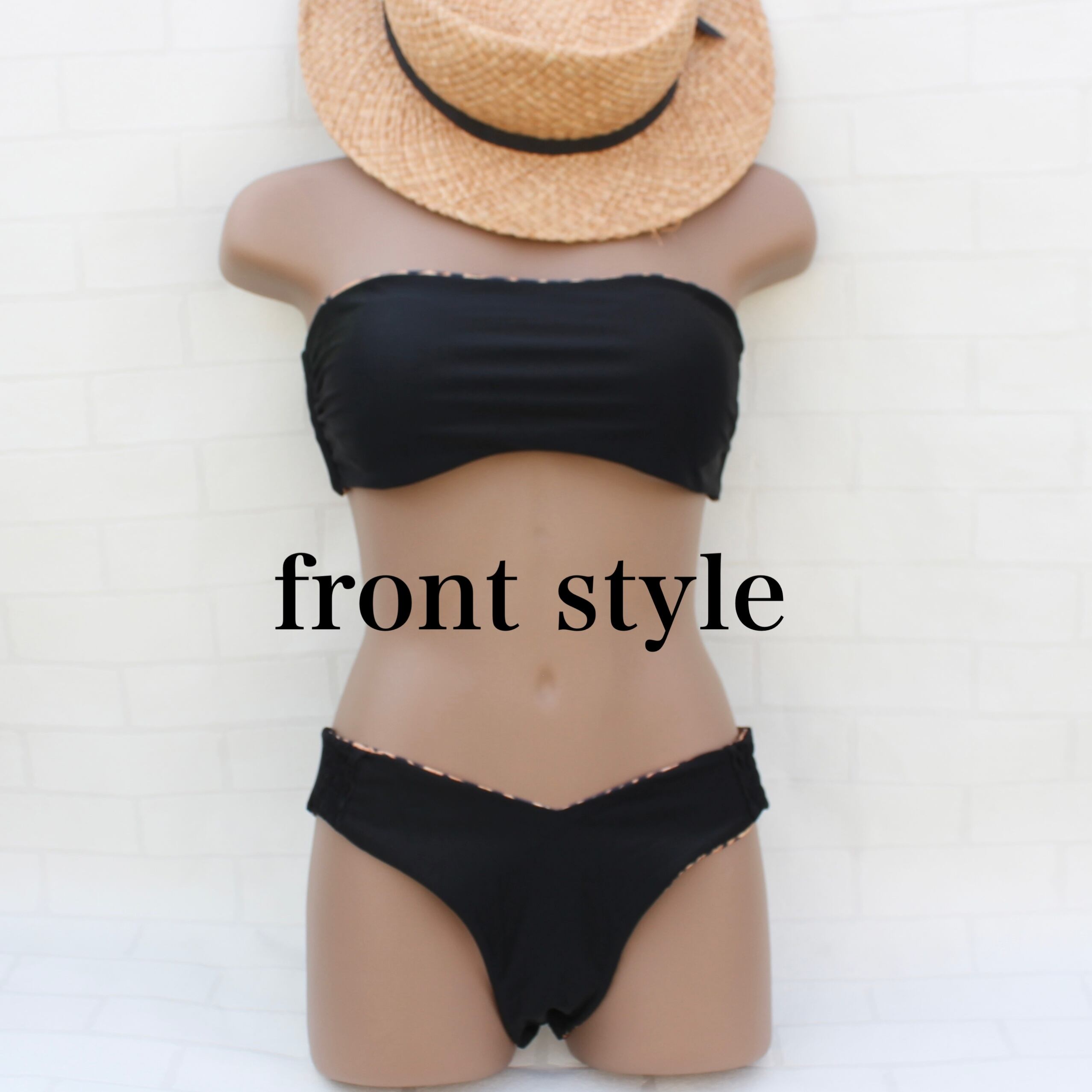 上下リバーシブルタイプのビキニです。上下リバーシブルタイプのビキニです。buckleは取り外し可能でストレートバンドゥでも着用できます。1着でたくさんのスタイルをお楽しみ下さい。